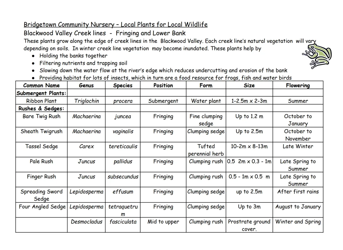 These plants grow along the edge of creek lines in the Blackwood Valley. Each creek line’s natural vegetation will vary depending on soils. In winter creek line vegetation may become inundated.